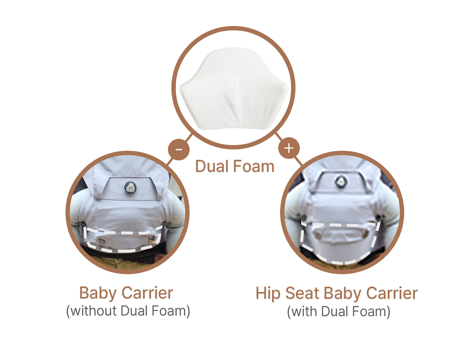 The Dual-Foam hip seat easily attaches and detaches from the waist belt of the Dial-Fit PRO Baby Carrier.