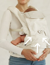 2. Adjust the webbing belt behind the shoulder straps to make both sides equal in length. Average lengths: women 22-27 cm, men 15-20 cm. Once adjusted, tighten the dial to fit baby comfortably.